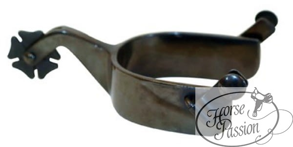 Rowel w kształcie czterolistnej koniczynki (cloverleaf) to jeden z łagodniejszych typów rowela dostępnych w sprzęcie western. Zaokrąglone płatki koniczynki nie koncentrują nacisku w jednym punkcie — działanie jest miękkie i równomierne. To ostrogi polecane przy treningu młodych koni, dla jeźdźców uczących się prawidłowego używania ostróg oraz przy dyscyplinach wymagających subtelnych pomocy jak western pleasure czy horsemanship. Czarne wykończenie black satin jest matowe i odporne na zarysowania — praktyczne przy codziennym użytkowaniu.
