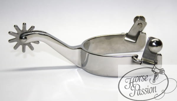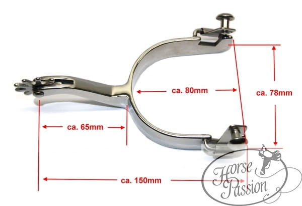Prosty trzonek o długości ok. 65 mm zapewnia dobry zasięg bez konieczności widocznego ruchu łydki — sprawdza się w treningu reiningowym, pleasure i all-around. Szeroka banda ok. 2,2 cm daje pewne i stabilne oparcie na obcasie buta bez ocierania. Okrągły button swivel ułatwia zakładanie i zdejmowanie pasków. To ostrogi, które po prostu działają — sesja po sesji, rok po roku.