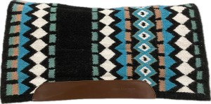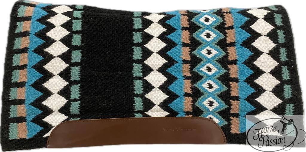 Pad western Arena Masters Show-Pad niebiesko-turkusowy — trójwarstwowa konstrukcja: wierzch z wełny nowozelandzkiej we wzorze Navajo w odcieniach niebieskiego i turkusu, środek z filcu amortyzującego wstrząsy, spód z wysokiej jakości fleece odprowadzającego wilgoć. Rozmiar 34×38" (ok. 86×96 cm) z głębokimi bokami (extra deep sides). Skórzane wzmocnienia typu grain wearleathers. Dostępny od ręki — wysyłka 48h.