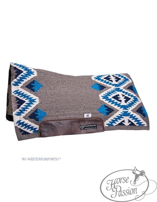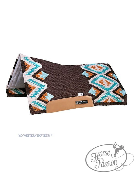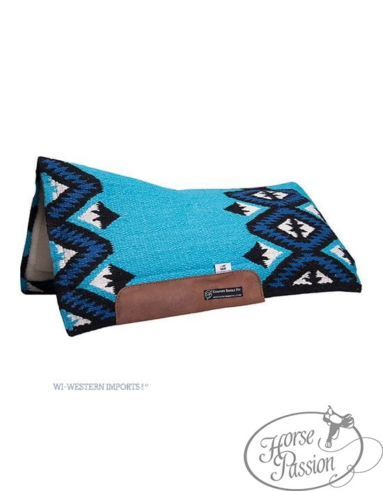 Pad CSF San Jaquinto Western Imports to konstrukcja trójwarstwowa z linii CSF w kompaktowej długości ok. 76 cm — przeznaczona do siodeł round skirt oraz dla kuców, arabów i koni o krótszym grzbiecie. Warstwę wierzchnią stanowi blanket show z wełny nowozelandzkiej we wzorze Navajo — tkany w ciasnym splocie, odporny na ścieranie i zachowujący intensywne kolory. Warstwę środkową stanowi wkładka CSF (Comfort Saddle Fit) — opatentowany materiał Western Imports, który pod wpływem ciepła ciała konia i wilgoci podczas jazdy lekko zmiękcza się i modeluje, równomiernie rozprowadzając nacisk siodła na większą powierzchnię grzbietu. Po jeździe i wystygnięciu wraca do pierwotnego kształtu.