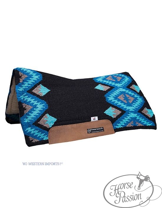 Pad western CSF San Jaquinto Western Imports — trójwarstwowa konstrukcja: wierzch z wełny nowozelandzkiej (blanket show), środkowa wkładka CSF (Comfort Saddle Fit) dopasowująca się do grzbietu konia, spód z naturalnego futra owczego. Długość ok. 76 cm — kompaktowy rozmiar do siodeł round skirt i koni o krótszym grzbiecie. Kilka wariantów kolorystycznych do wyboru.