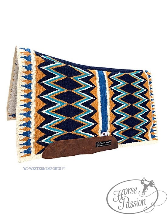Pad western CSF Zuma Western Imports w kolorze navy — trójwarstwowa konstrukcja z anatomicznie uformowaną wkładką CSF z pianki wysokiej jakości, spodem z gęstego wełnianego runa i ręcznie tkanym wełnianym blanketem od góry. Skórzane wzmocnienia na popręgu. Dostępny w dwóch długościach: 76 cm (krótki) i 83 cm (standardowy). Wysyłka 48h.