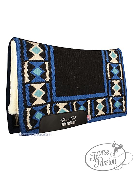 Pad western Professional's Choice Hourglass SMx Air Ride czarny — trójwarstwowa konstrukcja: wierzch z blanketu wełnianego show we wzorze hourglass, środkowy rdzeń SMx Air Ride (technologia z ochraniaczy sportowych), spód z wełny merino ok. 18 mm odprowadzającej wilgoć. Rdzeń Air Ride absorbuje o 12% więcej energii niż poprzednia generacja. Dwie długości do wyboru: 76 cm i 83 cm. Skórzane wzmocnienia.