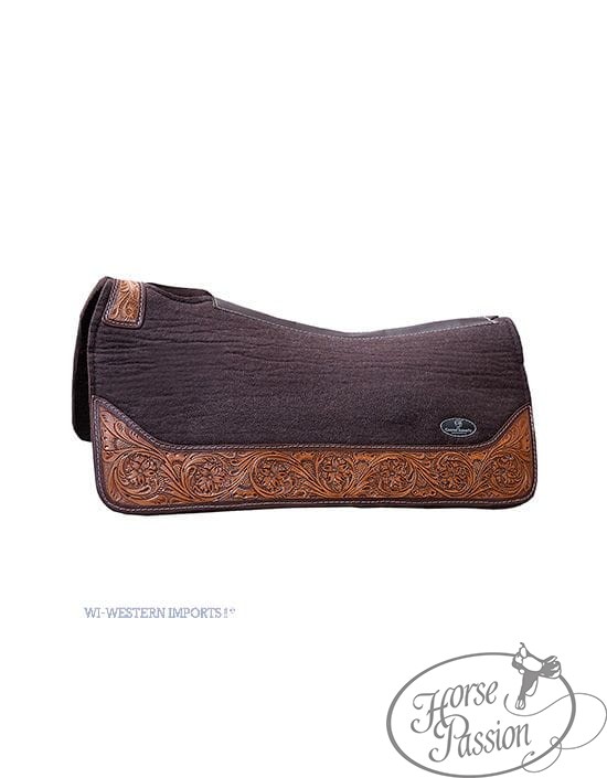 Pad western Supreme filcowy Western Imports — wykonany z filcu pełnego ze 100% wełny owczej bez dodatków syntetycznych. Grubość 1" (ok. 2,5 cm), wymiary 81×84 cm (32"×33"). Zdobione skórzane wzmocnienia z tłoczeniami (tooled leather) w strefie popręgu i wycięciem na kłąb. Filc pełny jest znacznie trwalszy niż filc igłowy.