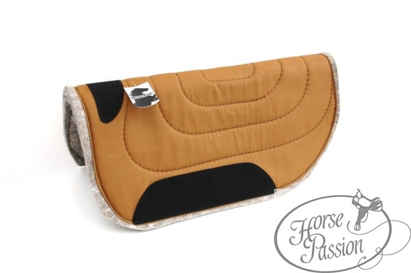 Pad western round krótki Mustang to pad roboczy w zaokrąglonym kształcie, zaprojektowany z myślą o koniach wrażliwych na nacisk oraz o siodłach round skirt. Spodnia strona — przylegająca do grzbietu konia — wykonana jest z bardzo miękkiego filcu, który jest delikatny dla skóry, nie podrażnia grzbietu i dobrze sprawdza się u koni z tendencją do obtarć lub wrażliwością na twardsze materiały. Warstwa zewnętrzna (pod siodłem) to canvas — mocny, wytrzymały materiał odporny na ścieranie od popręgu, fenderów i strzemion, zapewniający trwałość pada przy codziennym użytkowaniu.