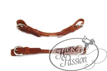 Skóra harness w kolorze kasztan jest grubsza i bardziej odporna na rozciąganie niż standardowe skóry chromowe — właściwość istotna dla curb strapa, który przy każdym sygnale czanki jest poddawany naprężeniu. Kolor kasztan pasuje do ogłowi i siodeł w odcieniach medium brown, golden tan i honey. O-ringi po obu stronach stanowią punkt mocowania do uszek czanki — bez klamry regulacyjnej, co upraszcza zakładanie i zdejmowanie.