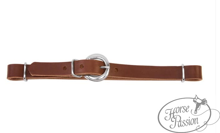 Szerokość 5/8" (ok. 16 mm) to standard dla pasków pod czankę w USA — wystarczająco wąska, by nie ingerować w pracę czanki, wystarczająco szeroka, by komfortowo rozkładać nacisk pod żuchwą konia. Owalna klamra niklowana z elegancką formą dopasowuje się estetycznie do standardowych zestawów ogłowie + czanka w kolorze kasztan i medium brown. Prosta regulacja przez klamrę — pas przez ring ogłowia czanki, dopasowanie długości przez klamrę. Przydatny wybór jako zapasowy curb strap do stajni, pasek do codziennych treningów lub tania alternatywa przed inwestycją w premium latigo Hermann Oak.