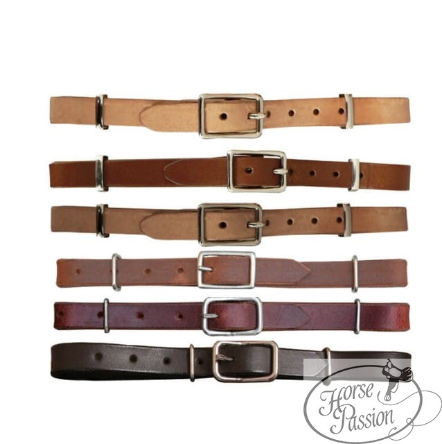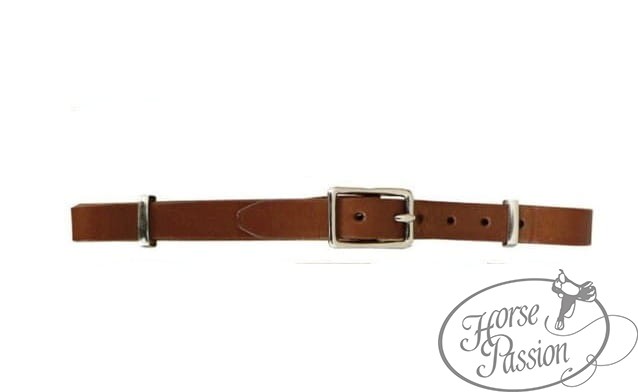 Pasek pod czankę skórzany w kolorze kasztan — regulowana długość przez prostokątną srebrną klamrę, D-ringi po obu stronach. Rozmiar standard. Pasuje do wszystkich popularnych wędzideł z dźwignią (luźne kółka, czanki munsztukowe, kiełzna). Łagodniejszy od łańcuszka metalowego.