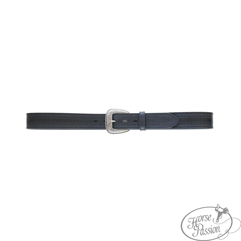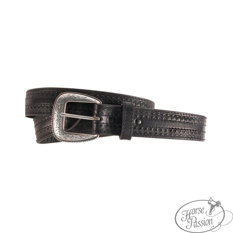 Klasyczny pasek western z tłoczeniem koszyczkowym i grawerowaną srebrną klamrą — element który wykańcza show outfit tak samo dobrze jak codzienną stylizację przy koniach. Tłoczenie koszyczkowe (basket weave) to jeden z najbardziej rozpoznawalnych wzorów w skórze western — regularny splot w kratę który wygląda tak samo elegancko na zawodach horsemanship jak przy pracy w stajni. Grawerowana klamra ze srebrnym wykończeniem w stylu kwiatowym pasuje do srebrnych okuć siodła, ostróg i ogłowia.