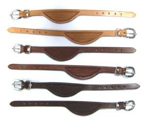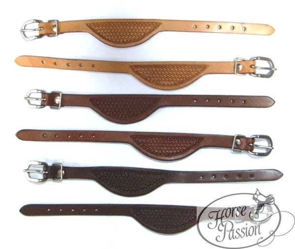 Paski wykonane są ze skóry naturalnej z dekoracyjnym tłoczeniem basket weave (wzór koszyczkowy) — klasycznym zdobieniem w estetyce western. Metalowa klamra pozwala na regulację długości. Dostępne w trzech odcieniach skóry: jasnym (natural), kasztanowym (medium brown) i ciemnym (dark brown/dark oil) — do dopasowania do koloru siodła, fenderów i strzemion.