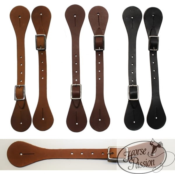 Dostępne w trzech kolorach skóry: jasnym (naturalnym), kasztanowym i ciemnym (czarnym). Jasny pasuje do butów kowbojskich w naturalnym odcieniu i jasnobrązowych siodeł. Kasztan to najuniwersalniejszy wybór — pasuje do większości standardowych zestawów. Ciemny (czarny) współgra z czarnymi butami, czarną stalą ostróg i ciemnymi siodłami.