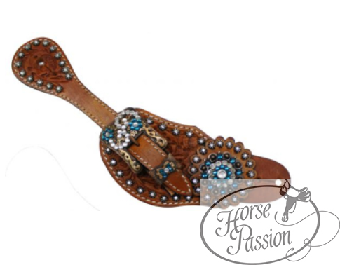 Paski do ostróg western show kasztan, niebieskie cyrkonie, flower tooling