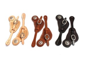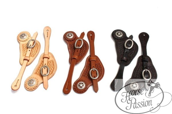Paski do ostróg western z gwiazdą — gruba skóra bydlęca z tłoczeniem basket weave i srebrną gwiazdą pośrodku. Klamra i zdobienia ze stali nierdzewnej. Dostępne w trzech kolorach: jasnym (naturalnym), kasztanowym i ciemnym. Para.