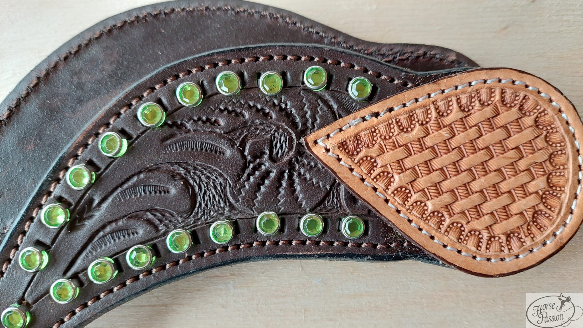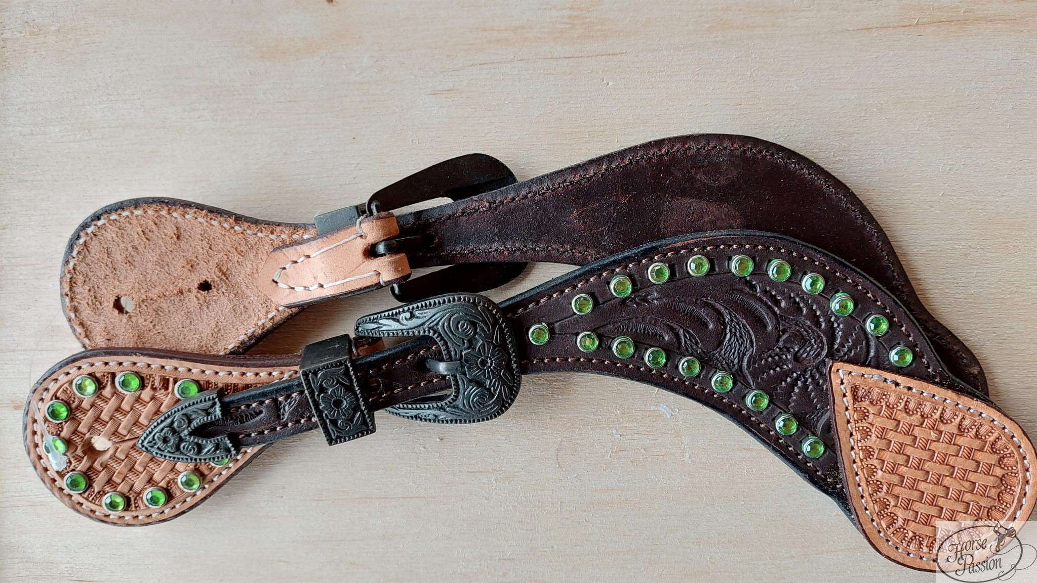 Paski do ostróg western z zielonymi kryształkami — naturalna skóra z tłoczeniem (basket weave lub floral) i zielonymi kryształkami w srebrnych oprawkach wzdłuż krawędzi. Czarna ozdobna sprzączka z grawerem floral. Dostępne w dwóch kolorach skóry: jasnobrązowym i ciemnobrązowym. Para, wysyłka 48h.