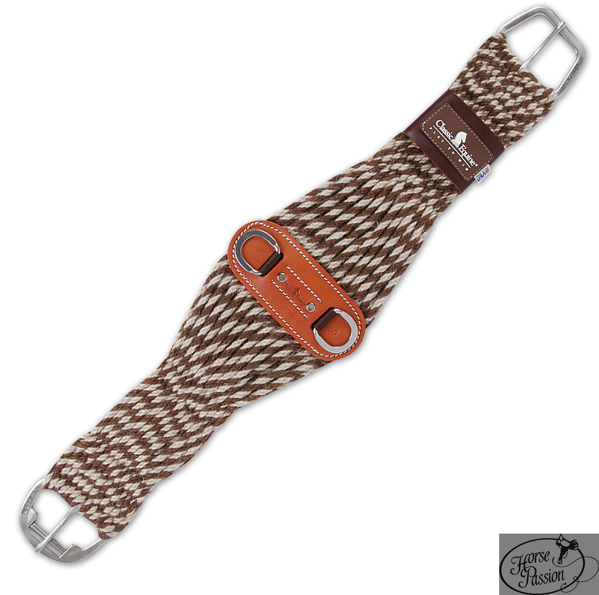 Popręg western moher/alpaka Classic Equine CRCMA — ręcznie tkany z 100% blendów włókien moheru i alpaki w charakterystycznym wzorze vintage western. Kształt roper — najszerszy w centrum (ok. 7"/18 cm), zwężony przy klamrach — zapewnia stabilność siodła i dużą powierzchnię kontaktu. Klamra rolkowa stalowa, centralny panel skórzany z dwoma D-ringami. Rozmiary 26"–36". Made in USA.