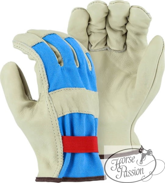 Zamiast zużywać drogie, delikatne rękawiczki jeździeckie podczas rąbania drewna, obsługi taczki czy noszenia wiader z wodą, postaw na klasyczne rękawice robocze. Model wykonany ze skóry bydlęcej to sprawdzony od dekad standard dla ranczerów i stajennych — łączy w sobie wysoką odporność mechaniczną z bardzo przystępną ceną. Charakterystyczne połączenie jasnej skóry z niebieskim materiałem tekstylnym i elastycznym ściągaczem to gwarancja, że rękawice dobrze leżą i pozwalają dłoniom oddychać.