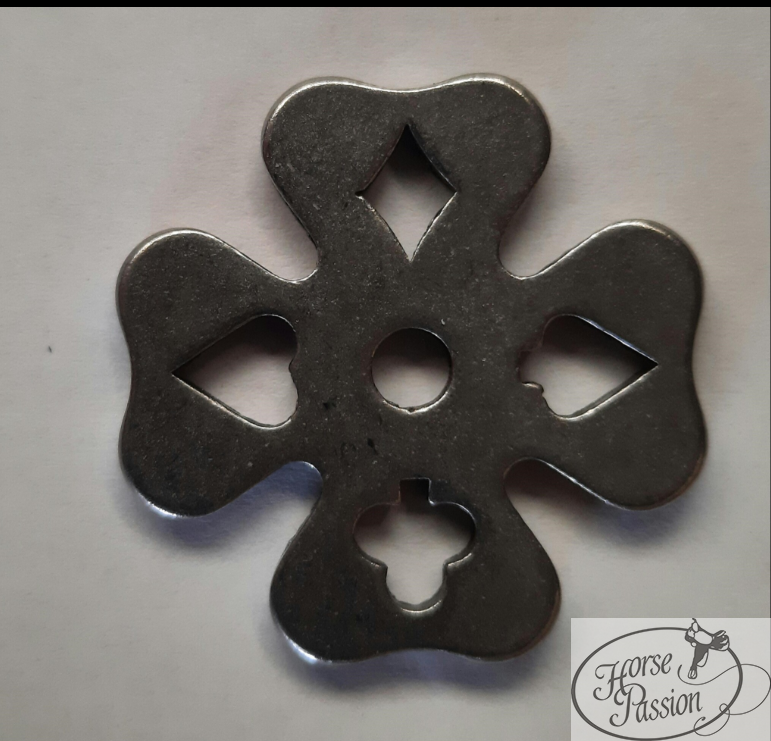 Rowel do ostróg western koniczynka GVR — stal szlachetna, charakterystyczna 4-ramienna koniczynka z wyciętymi rombami i kwiatem w centrum. Pasuje do większości ostróg western z wymiennym rowelem. Delikatne, równomierne działanie.