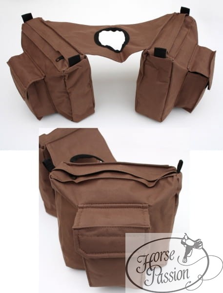 Sakwa nylonowa na horn w kolorze brązowym to praktyczne akcesorium montowane na rogu siodła westernowego. Dwie boczne komory oraz dodatkowe kieszenie zewnętrzne umożliwiają wygodne przechowywanie drobnych przedmiotów podczas jazdy trailowej, rekreacyjnej oraz codziennego użytkowania. Wymiary sakwy: ok. 19 × 20 × 7 cm.