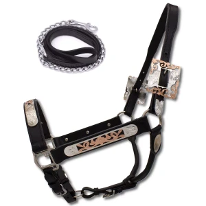Show Halter skórzany LPTrick — czarny kantar pokazowy ze zdobieniami w kolorze różowego złota (rosegold) i dekoracyjnie wycinanymi klamrami. Regulacja w pięciu miejscach zapewnia precyzyjne dopasowanie do głowy konia. W zestawie łańcuszek wykonany z dwuwarstwowej skóry. Rozmiar AQH (American Quarter Horse).