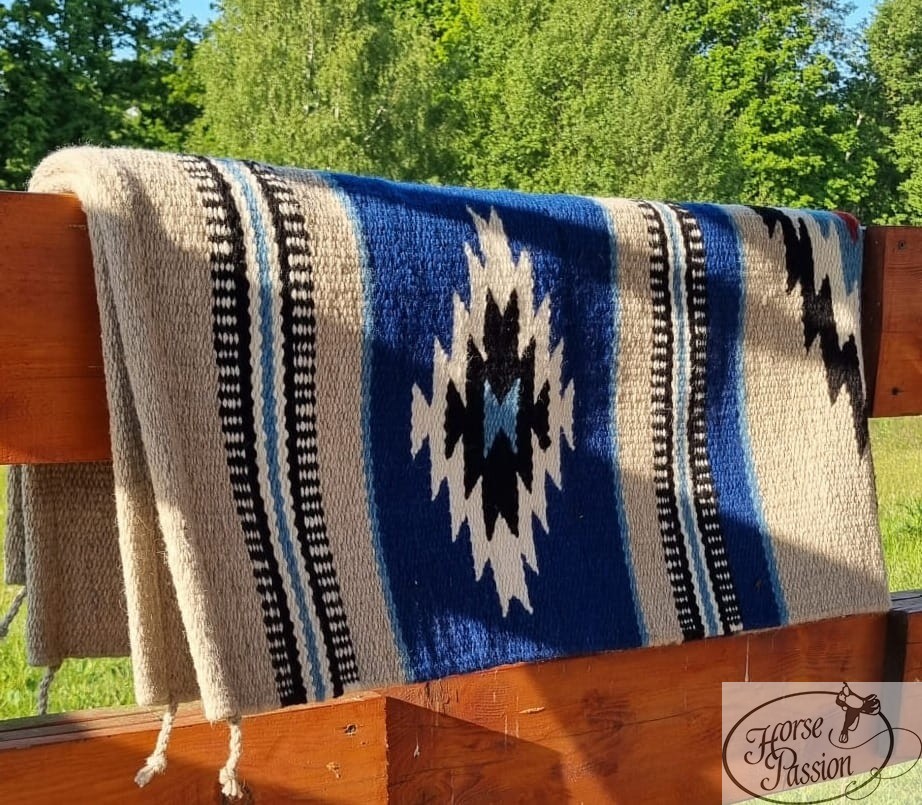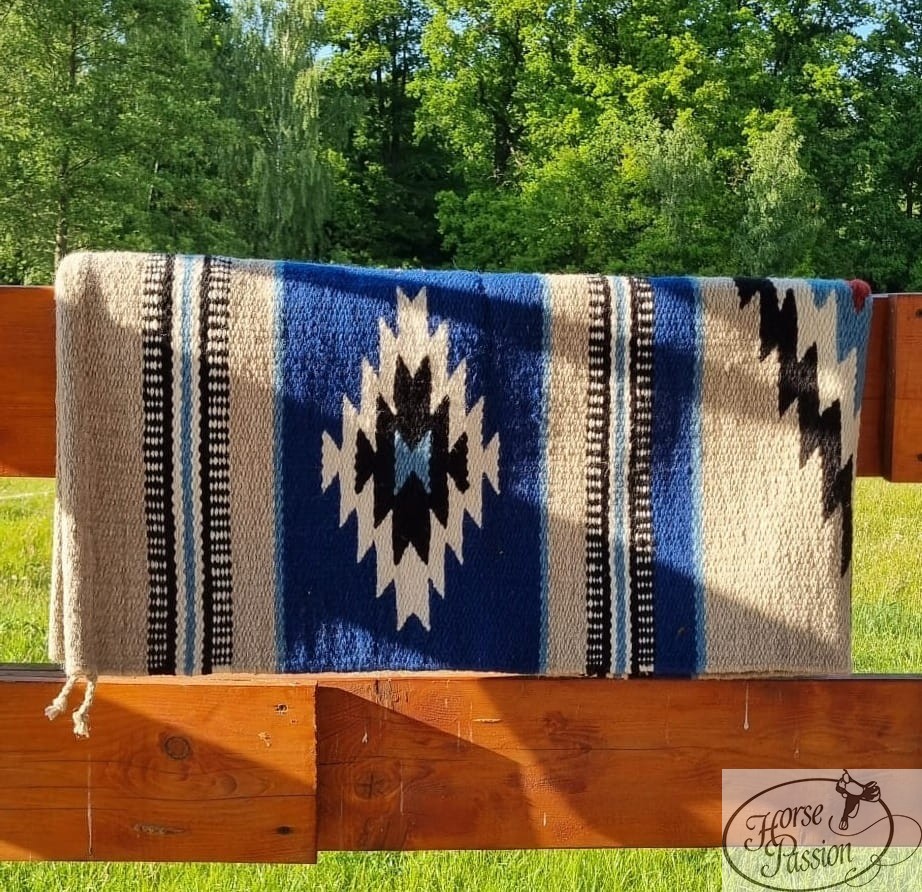 Kocyk umieszczany jest pomiędzy padem a siodłem i pozostaje widoczny podczas jazdy, podkreślając kolorystykę oraz styl westernowy. Kolor niebieski sprawdza się zarówno u koni jasnych, jak i ciemnych, tworząc wyraźny, ale elegancki kontrast.