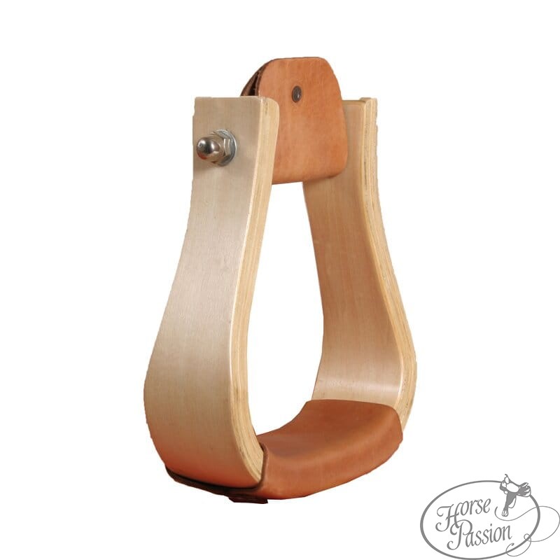 Strzemiona drewniane Westernwelt to klasyczna konstrukcja westernowa z drewna klejonego warstwowo (laminowanego), pokrytego lakierem chroniącym przed wilgocią i uszkodzeniami mechanicznymi. Jasny, naturalny odcień drewna z widocznymi warstwami laminatu nadaje strzemionom czysty, tradycyjny wygląd — bez tłoczeń, grawerów i zdobień. Stopa (tread) obciągnięta jest skórą natural, dającą pewne oparcie dla buta.