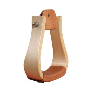 Jasne drewno lakierowane i skóra natural na stopie — klasyczne strzemiona westernowe w minimalistycznym wykończeniu.