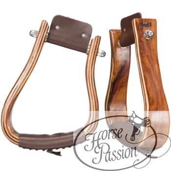 Strzemiona wykonane są z drewna mahoniowego — twardego, lekkiego i trwałego gatunku drewna o ciepłym, brązowo-czerwonym odcieniu. Wykończenie imituje fakturę starego drewna, nadając strzemionom charakter vintage western — każda para wygląda nieznacznie inaczej. Powłoka poliuretanowa chroni drewno przed wilgocią, potem i uszkodzeniami mechanicznymi, wydłużając żywotność strzemion nawet przy intensywnym, codziennym użytkowaniu.
