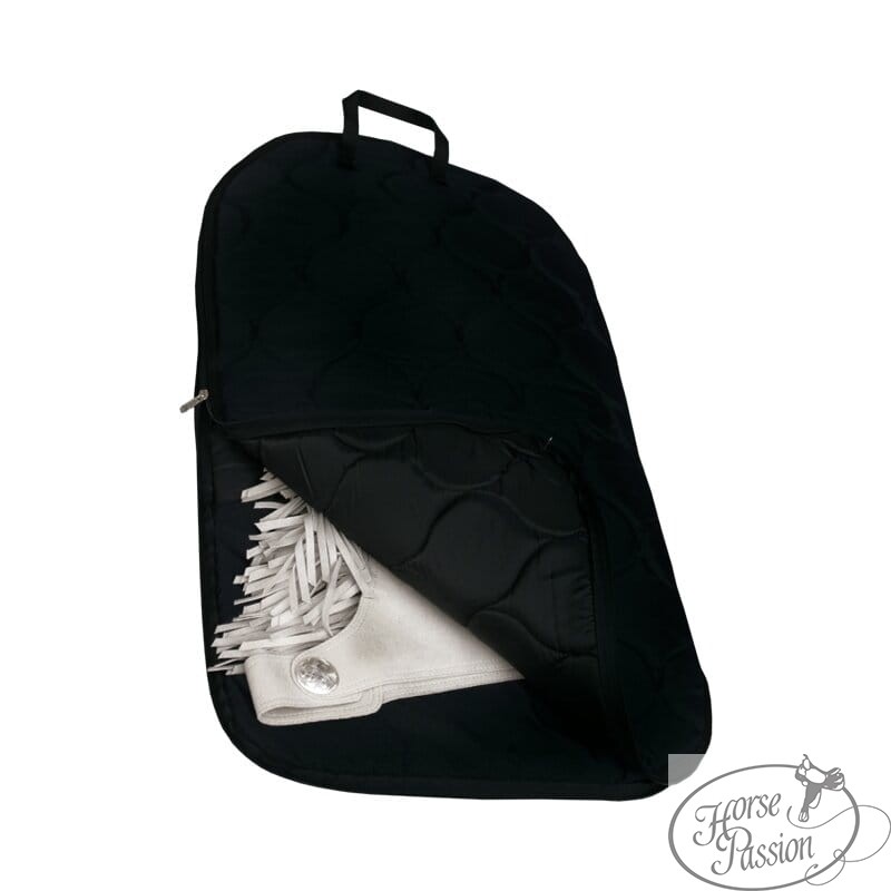 Pikowana czarna tkanina zewnętrzna jest odporna na zarysowania i zabrudzenia — łatwa do przetarcia wilgotną ściereczką po zawodach. Pikowana wewnętrzna warstwa chroni skórę czapsów przed otarciami i kontaktem z twardymi elementami w torbie sprzętowej. Zamek na całym obwodzie umożliwia szybkie otwarcie i złożenie czapsów bez ich wyginania. Uchwyt tekstylny na górze do wygodnego przenoszenia. Mieści czapsy show z frędzlami i bez — widoczne na zdjęciu czapsy mikrofibry z conchami i frędzlami mieszczą się swobodnie.