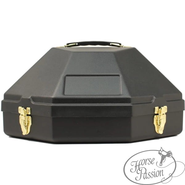 Dwa metalowe zatrzaski zapewniają pewne zamknięcie — box nie otworzy się przypadkowo w bagażu. Plastikowy uchwyt na górze sprawia że można go nieść jak walizeczkę. Mieści kapelusze do rozmiaru XXL — zarówno standardowe kapelusze show z szerokim rondem, jak i modele trail o głębszej koronie.
