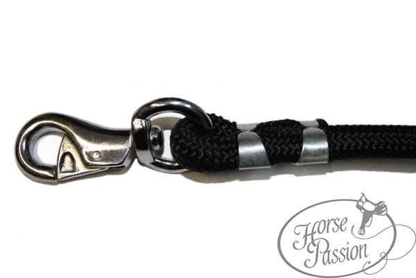 Karabińczyk bull snap z obrotową głowicą to szczegół, który przy codziennym wiązaniu konia robi wyraźną różnicę. Standardowy karabińczyk bez swornia obrotu przy wielokrotnym przypinaniu i odpinaniu skręca linę — po tygodniu użytkowania uwiąz tworzy stałe naprężenie skrętne. Obrotowa głowica w karabińczyku tego modelu pozwala koniowi swobodnie ruszać głową bez narastającego skrętu na linie. Chromowane wykończenie karabińczyka nie rdzewieje przy regularnym kontakcie z potem konia i wilgocią stajni. Gęsty splot czarnej liny zachowuje kształt i kolor przez lata użytkowania.