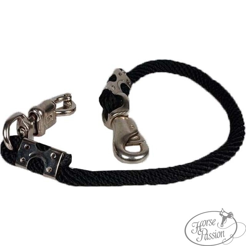 Karabińczyk bezpieczeństwa (paniczny hak) po stronie mocowania do ściany przyczepy lub belki to kluczowy element przy transporcie. W sytuacji awaryjnej — gdy koń wpada w panikę i szarpie — paniczny hak można zwolnić jednym ruchem pod pełnym obciążeniem liny, bez konieczności przecinania. To standard bezpieczeństwa w transporcie koni, którego nie zapewni zwykły węzeł ani standardowy karabińczyk. Bull snap po stronie kantara zapina się i odpina szybko w normalnych warunkach codziennej obsługi.