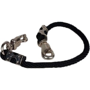 Uwiąz transportowy do przyczepy i stajni — krótka lina z karabińczykiem bezpieczeństwa (panikhook) z jednej strony i bull snap z drugiej. Dwa karabińczyki eliminują konieczność wiązania węzłów — przyczepa gotowa do załadunku w kilka sekund. Kolor czarny.