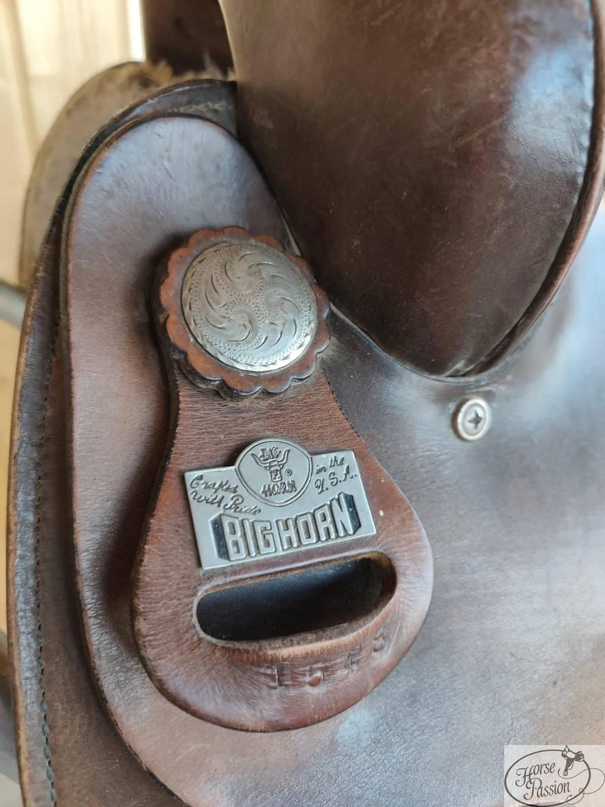 Używane siodło western Big Horn 15" — klasyczny model trail/ranch w dwukolorowym wykończeniu: ciemnobrązowe boki z wyraźnie czarnym siedziskiem. Floral tooling na tylnych połach, srebrne conchos z grawerunkiem, strzemiona oxbow z owijaniem sznurowym, podwójny rigging i troki na sakwy. Możliwa bezpłatna przymiarka przed zakupem.