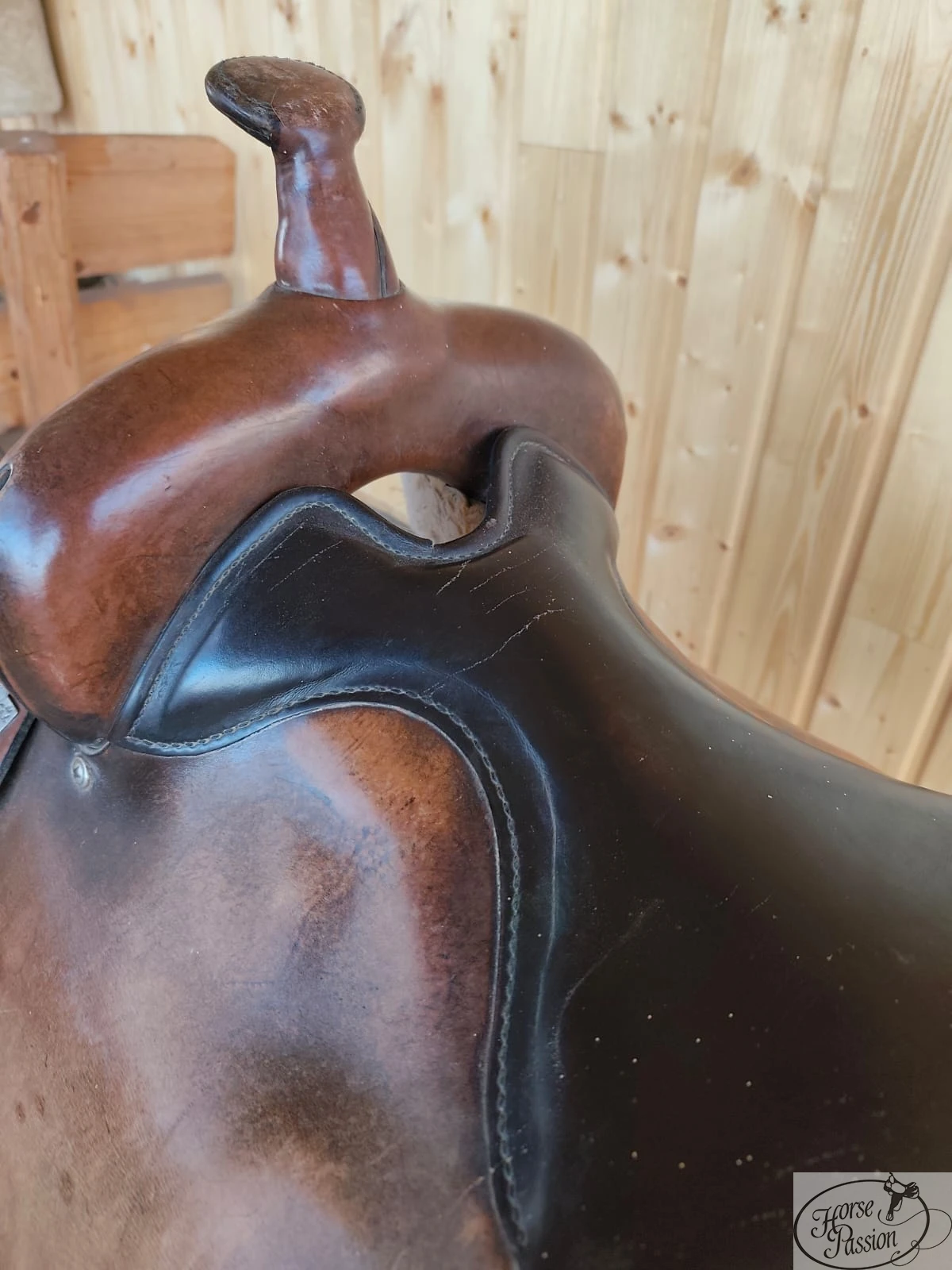 Big Horn to jeden z najbardziej rozpoznawalnych amerykańskich producentów siodeł w segmencie trail i codziennej jazdy westernowej — a ten egzemplarz wyróżnia się dwukolorowym wykończeniem, którego nie spotyka się w każdym modelu. Ciemnobrązowa skóra boków, połów i fenderów kontrastuje z wyraźnie czarnym siedziskiem — połączenie klasyczne, o wyraźnym charakterze. Siodło jest w dobrym stanie technicznym: terlica zweryfikowana bez uszkodzeń, skóra zachowana, ślady użytkowania widoczne na siodzisku mają wyłącznie charakter wizualny i nie wpływają na funkcjonowanie siodła.