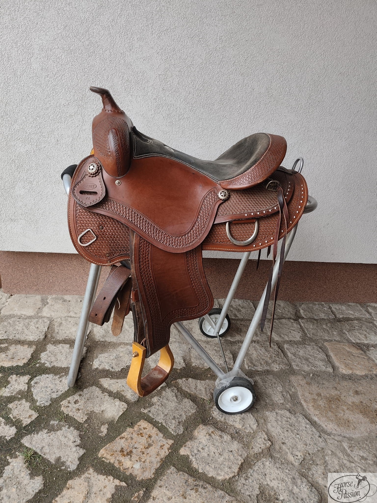 Bisbee to marka zachodnia kojarzona z solidnymi siodłami trail w przystępnych cenach — a ten egzemplarz wyróżnia się połączeniem czarnego zamszowego siedziska z ciepłobrązowym korpusem i pełnym basket toolingiem, które razem dają wyrazisty, klasyczny charakter westernowy. Krótka terlica o długości 64 cm kieruje siodło w stronę koni o zwartej budowie grzbietu — arabów, kuców i kwarterhorseów, na których standardowe siodło 70+ cm wysuwa się na lędźwie lub nie daje odpowiedniego podparcia przedniego łęku. Terlica zweryfikowana — bez uszkodzeń strukturalnych. Stan techniczny dobry; na skórze jockeya widoczne powierzchniowe zarysowania o charakterze wyłącznie wizualnym, nienaruszające struktury skóry.