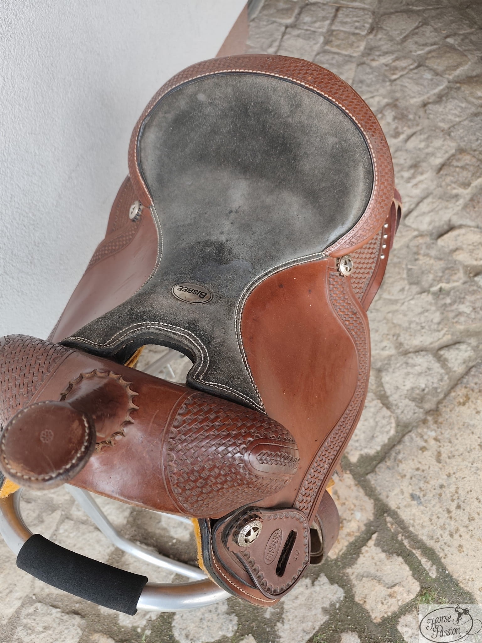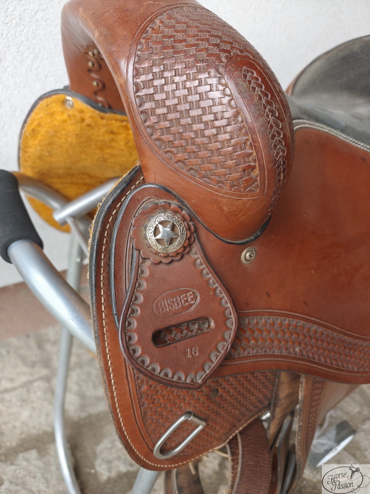 Używane siodło western Bisbee 16" — krótka terlica (64 cm) przeznaczona dla konia o krótszym grzbiecie: araba, kuca lub kwarterhorsa o zwartej budowie. Czarne zamszowe siedzisko z owalnym stemplem marki, basket tooling na wszystkich powierzchniach, gwiazdkowe conchos Texas Ranger, ćwieki wzdłuż krawędzi połów, drewniane strzemiona i troki na sakwy. Możliwa bezpłatna przymiarka przed zakupem.