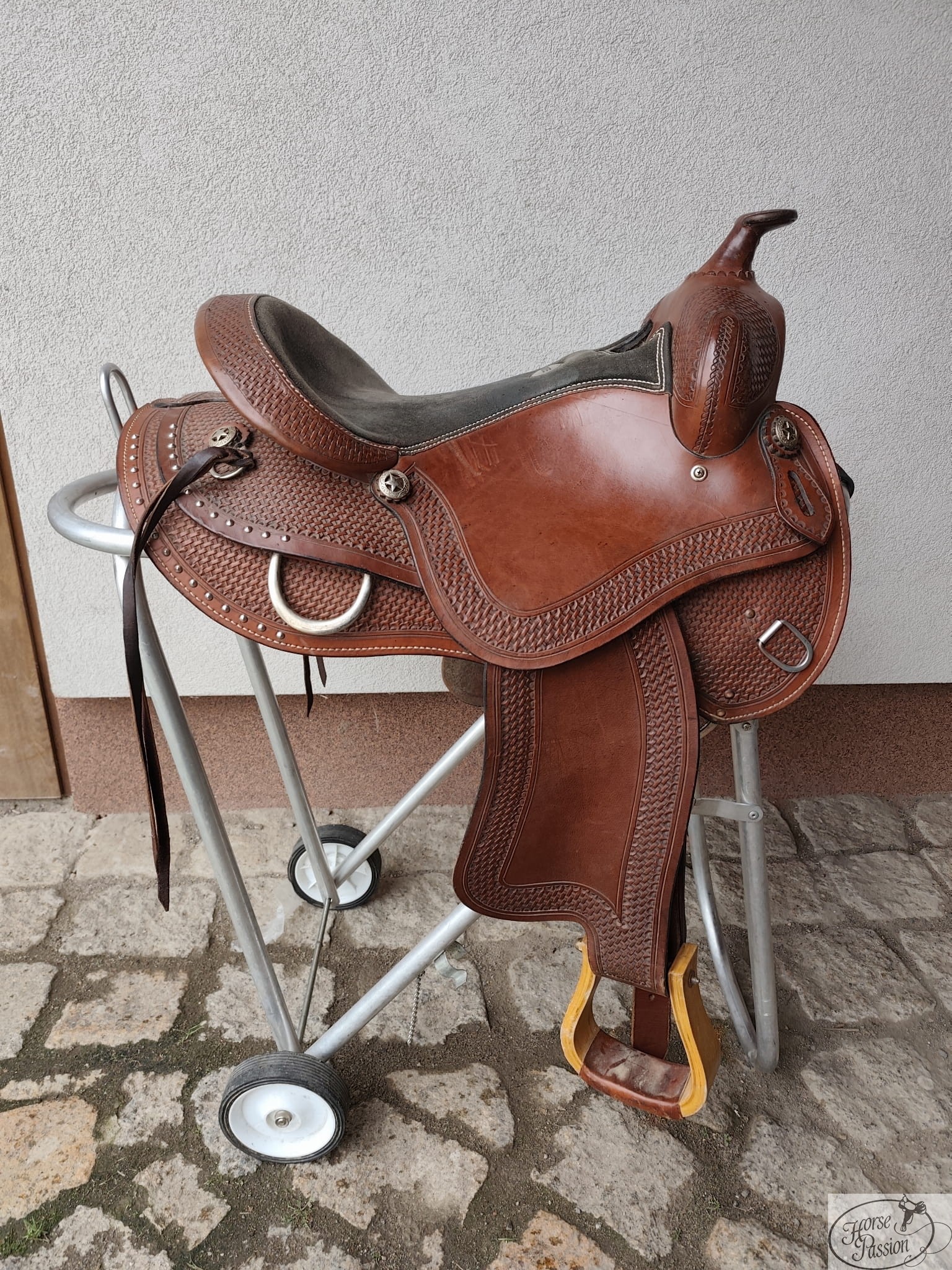 Basket tooling pokrywa boki, połe i fendery — jednolity wzór na całej powierzchni dekoracyjnej. Gwiazdkowe conchos w stylu Texas Ranger przy łęku i na cantle nadają siodłu wyrazisty, kowbojski charakter. Ćwieki wzdłuż krawędzi połów to dekoracyjny detal typowy dla tego profilu stylistycznego. Drewniane strzemiona, skórzane tie strap i off-billet, troki przy cantle umożliwiające zapięcie sakw — siodło gotowe do jazdy w terenie bez dodatkowych nakładów.