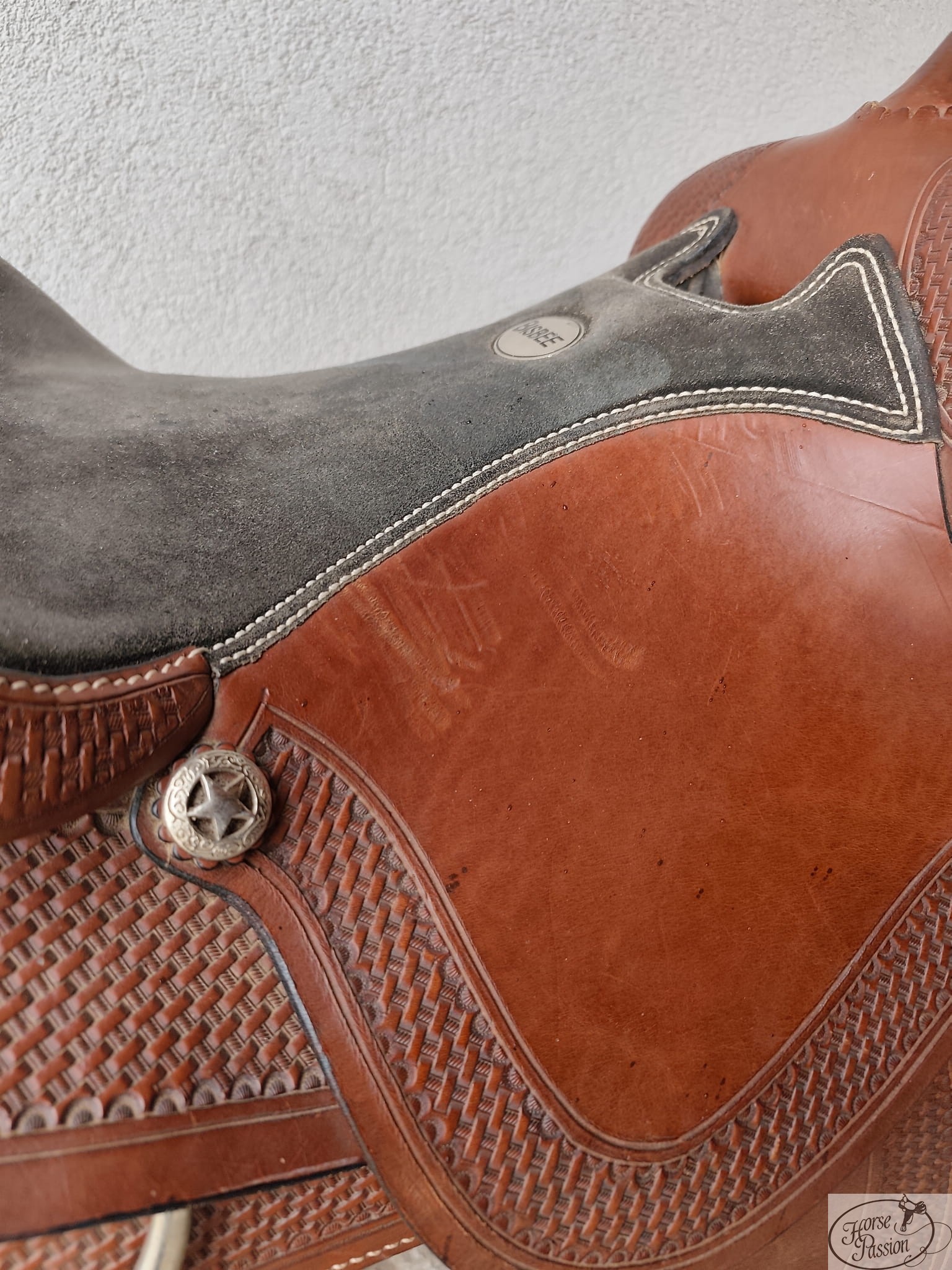 | Zdobienie | Basket tooling (boki, połe, fendery), ćwieki wzdłuż krawędzi połów, gwiazdkowe conchos Texas Ranger |