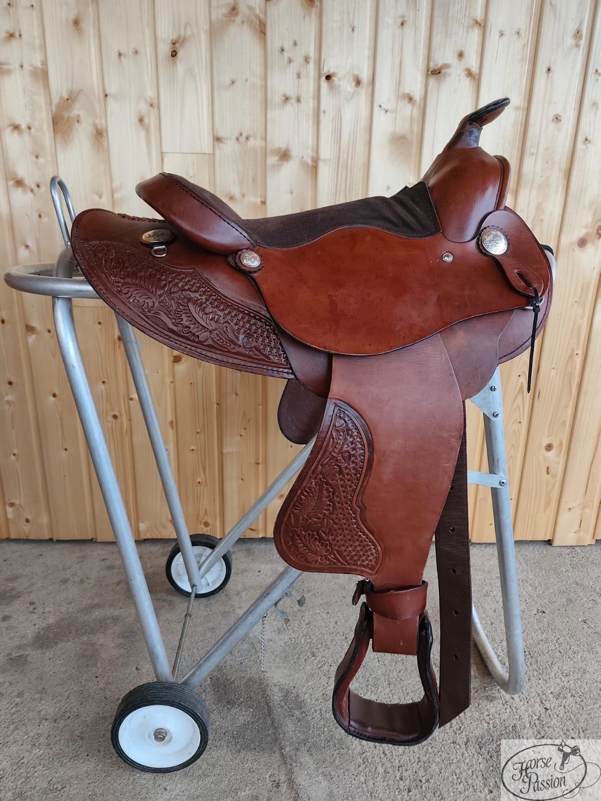 Używane siodło western Circle A American Saddlery 14" — model 903, hand crafted, z ciemnoczekoladowym zamszowym siedziskiem i kombinowanym toolingiem basket + floral acanthus. Krótka single skirt (60 cm) na kuca lub małego konia, wiśniowo-brązowa skóra w bardzo dobrym stanie. Możliwa bezpłatna przymiarka przed zakupem.