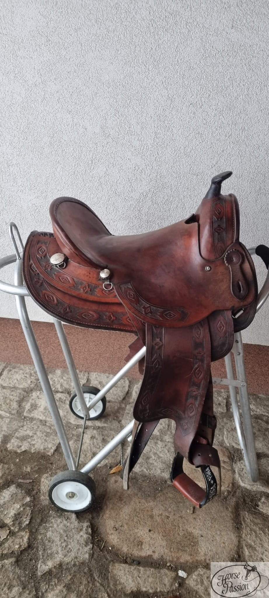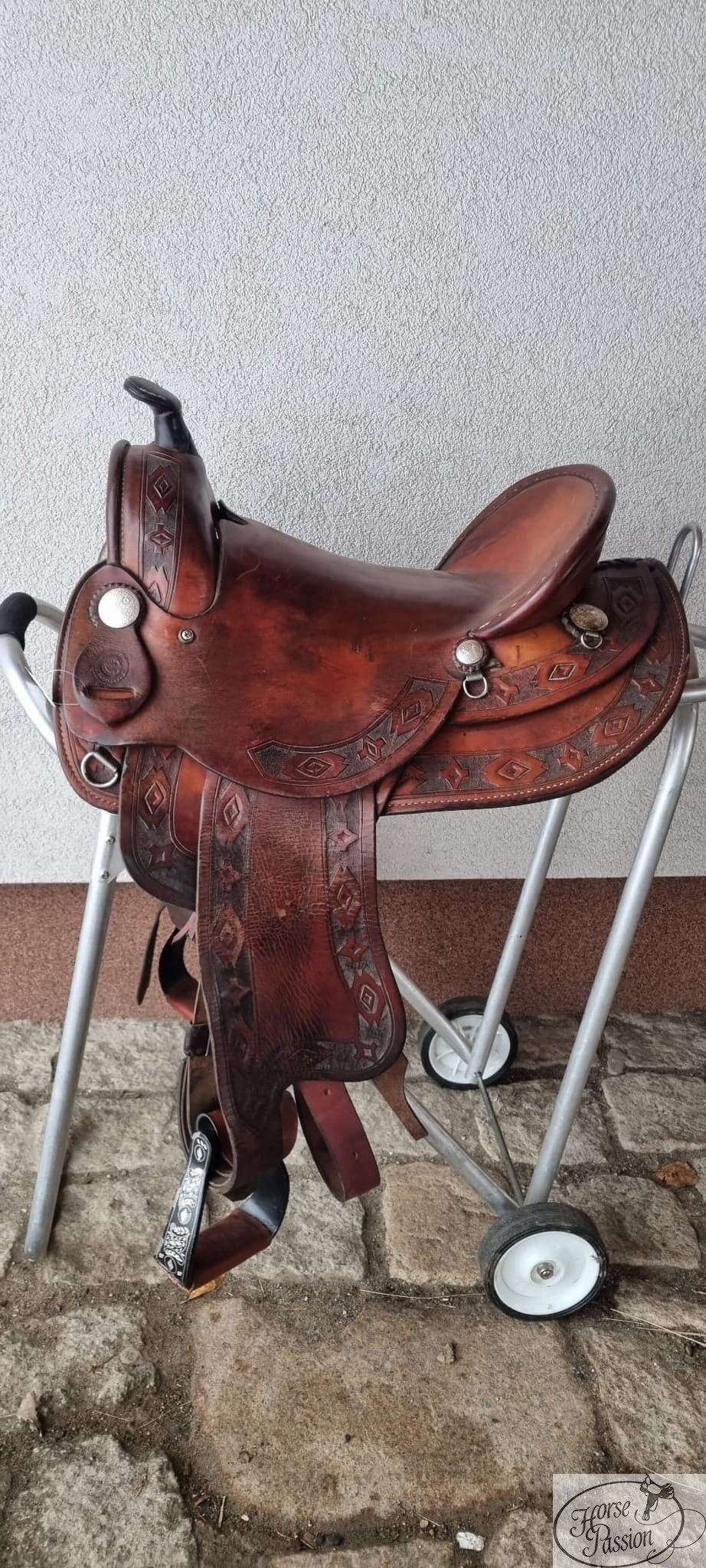 Spośród wszystkich siodeł w naszej komisowej ofercie to wyróżnia się toolingiem — geometryczny wzór aztecki/southwestern z rombami, gwiazdami i krzyżami w ciemno-jasnym dwutonowym układzie jest jedynym takim motywem w całym komisie. Ciemna tła toolingu kontrastuje z ciepłym brązem środkowych paneli połów, tworząc efekt głębi nieosiągalny w standardowych siodłach basket czy floral. Siodło jest w stanie dobrym: terlica zweryfikowana bez uszkodzeń, skóra zachowała strukturę, widoczne przetarcia i rozjaśnienia na siodzisku mają charakter użytkowy.