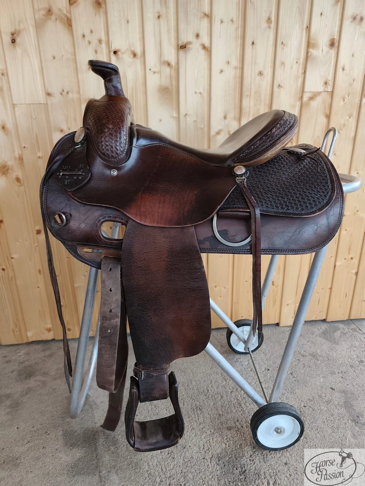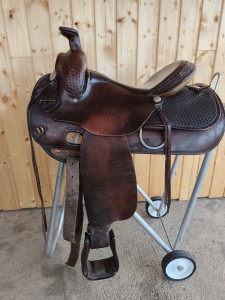 Używane siodło western Deuber & Partner 15" — solidny europejski producent siodeł westernowych, model ranch/roping z dużym skórzanym rogiem, basket toolingiem na połach i jockeyach, charakterystycznym systemem otworów do tie strap (zamiast D-ringów) i licznymi trokami. Przeznaczone dla konia o wąskiej budowie. Stan dobry. Możliwa bezpłatna przymiarka przed zakupem.