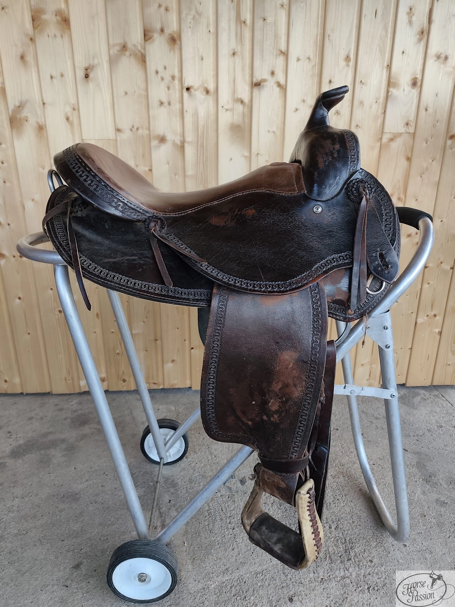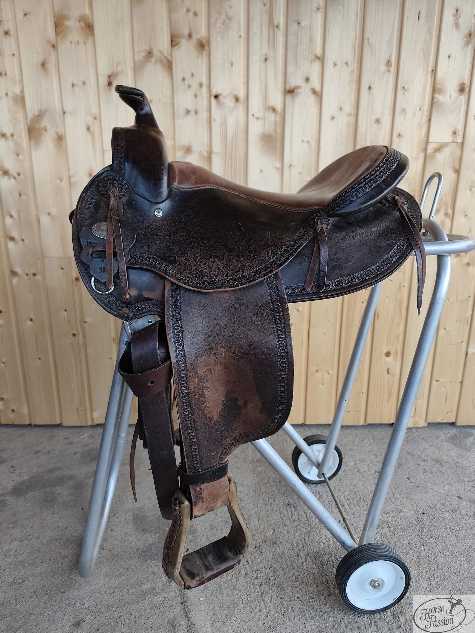 Używane siodło western Deuber & Partner 16" — model 7031, Saddle maker Germany. Scroll border tooling wzdłuż krawędzi połów i fenderów, single skirt (jedna warstwa połów), głęboka espresso patyna, liczne troki, skórzane tie strap i off-billet. Długość 58 cm — dla mniejszego konia. Stan z wyraźnymi śladami użytkowania. Możliwa bezpłatna przymiarka przed zakupem.