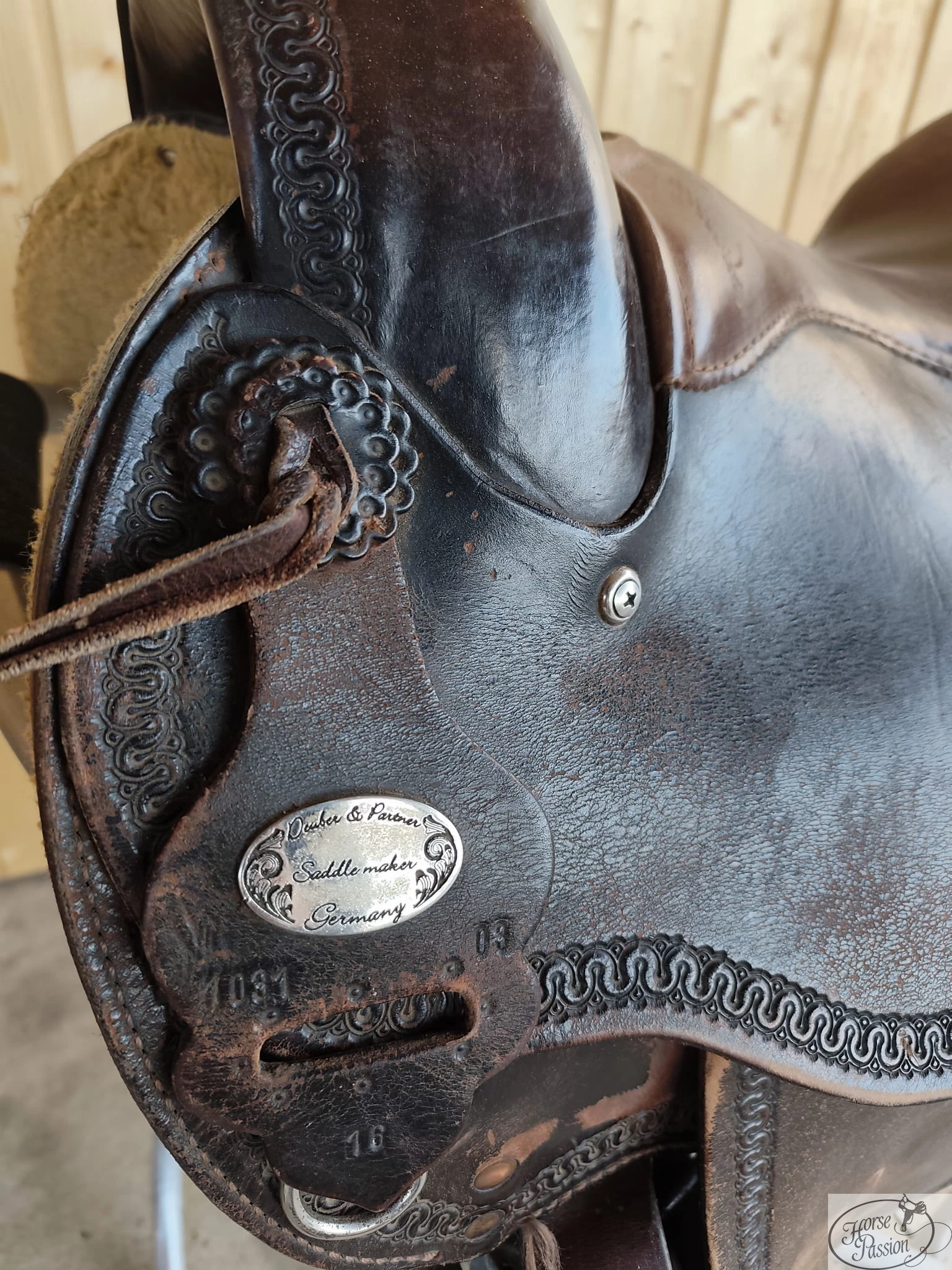 Drugi Deuber & Partner w naszej komisowej ofercie — i wyraźnie różny od lb323: mniejszy (58 cm vs brak pomiaru), inny wzór toolingu, single skirt zamiast podwójnych połów i ciemniejsza, bardziej zaawansowana patyna skóry. Deuber & Partner Saddle maker Germany to renomowana niemiecka marka siodeł westernowych — numer modelu 7031 i stempel rozmiaru 16 widoczne bezpośrednio pod medalionem. Terlica zweryfikowana bez uszkodzeń strukturalnych. Stan siodła wymaga uczciwego opisu: skóra fenderów i połów nosi wyraźne ślady wieloletniego użytkowania — nierównomierny kolor, plamy i przetarcia o charakterze użytkowym. Cena 3 200 zł odzwierciedla realny stan egzemplarza.