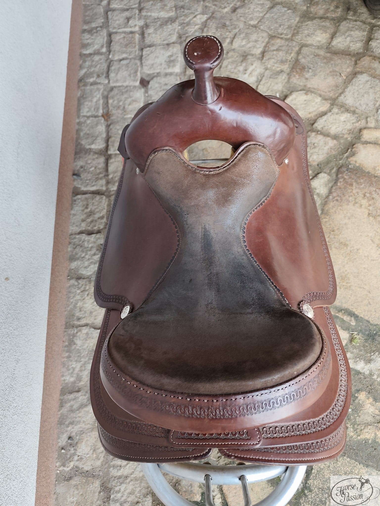 Śliskie, gładkie siedziska potrafią znacznie utrudnić prawidłową jazdę. Używane siodło westernowe cenionej marki Diamond C bardzo skutecznie rozwiązuje ten problem. Zostało ono wyposażone w głębokie, zamszowe siedzisko o doskonałych właściwościach antypoślizgowych. Zapewnia to wyjątkową stabilność i bezpieczeństwo na każdym treningu.