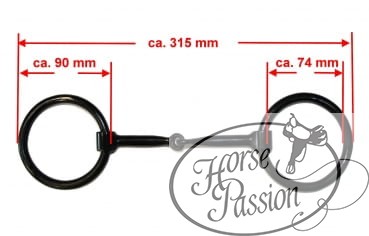 Rdzawienie jest celowe i prawidłowe — powierzchniowa rdza wzmaga żucie konia i nie jest wadą produkcyjną. Ringi są asymetryczne (lewy większy niż prawy) — ogłowie mocujemy do lewego (większego) ringa, wodze do obu. Przy zamawianiu ogłowia sprawdź czy pasuje do ringa 90 mm.