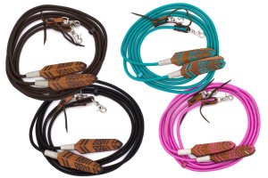 Okrągłe nylonowe split reiny JT International ze skórzaną końcówką (popper) i karabińczykami. Antypoślizgowy splot, profil okrągły, średnica ok. 1 cm, długość ok. 230 cm. Dostępne w czterech kolorach: różowy, czarny, brązowy, turkusowy. Skórzany popper na końcu wodzów to element funkcjonalny — inaczej niż dekoracyjne chwosty z końskiego włosia. Produkt na zamówienie — realizacja ok. 14 dni.