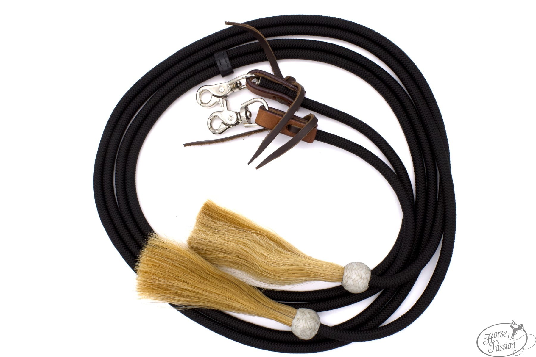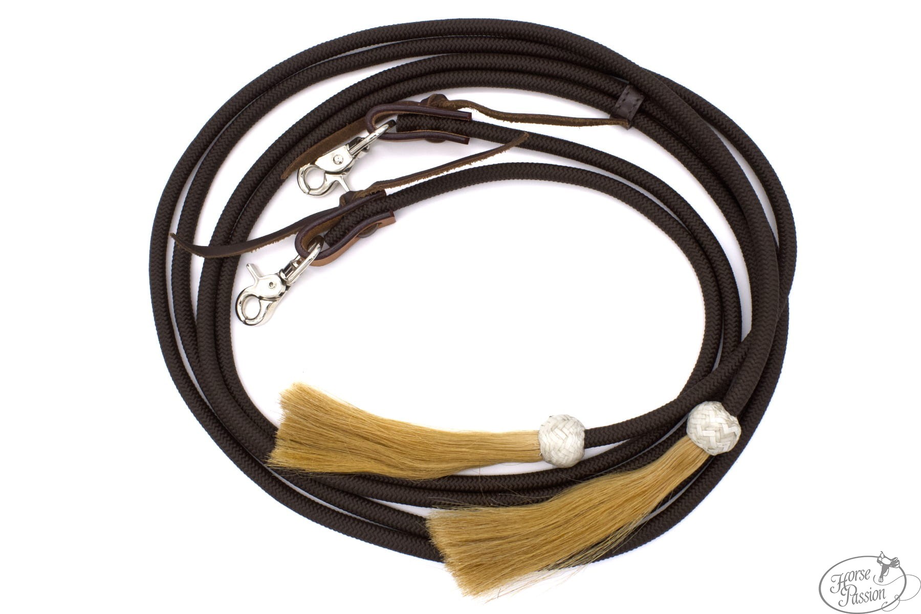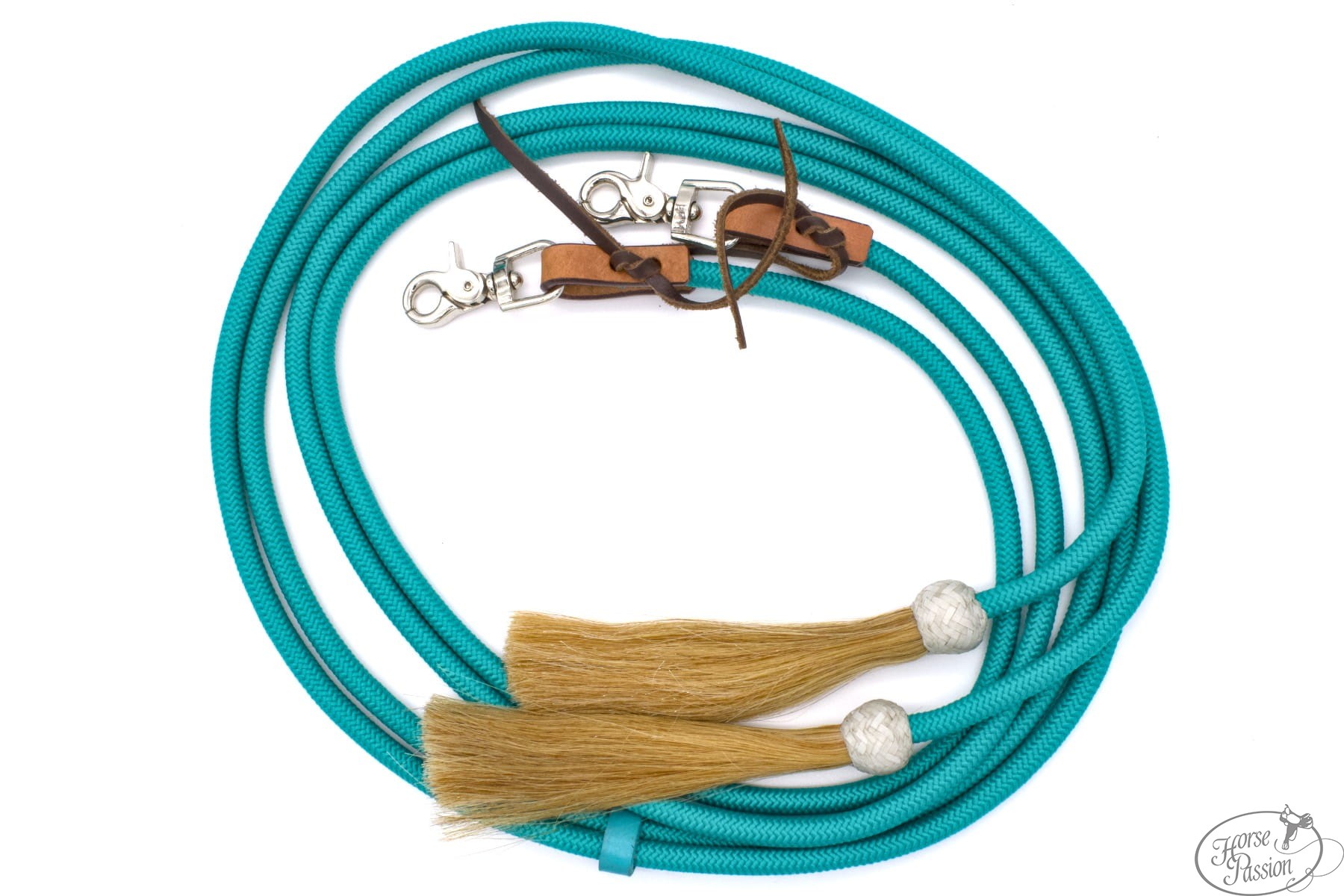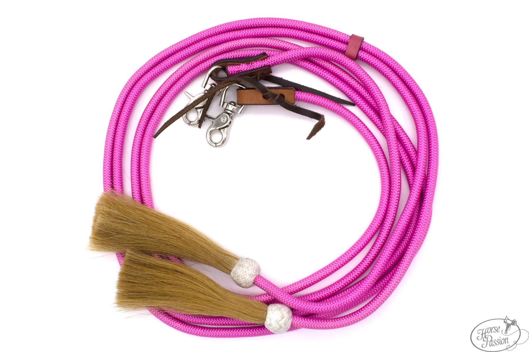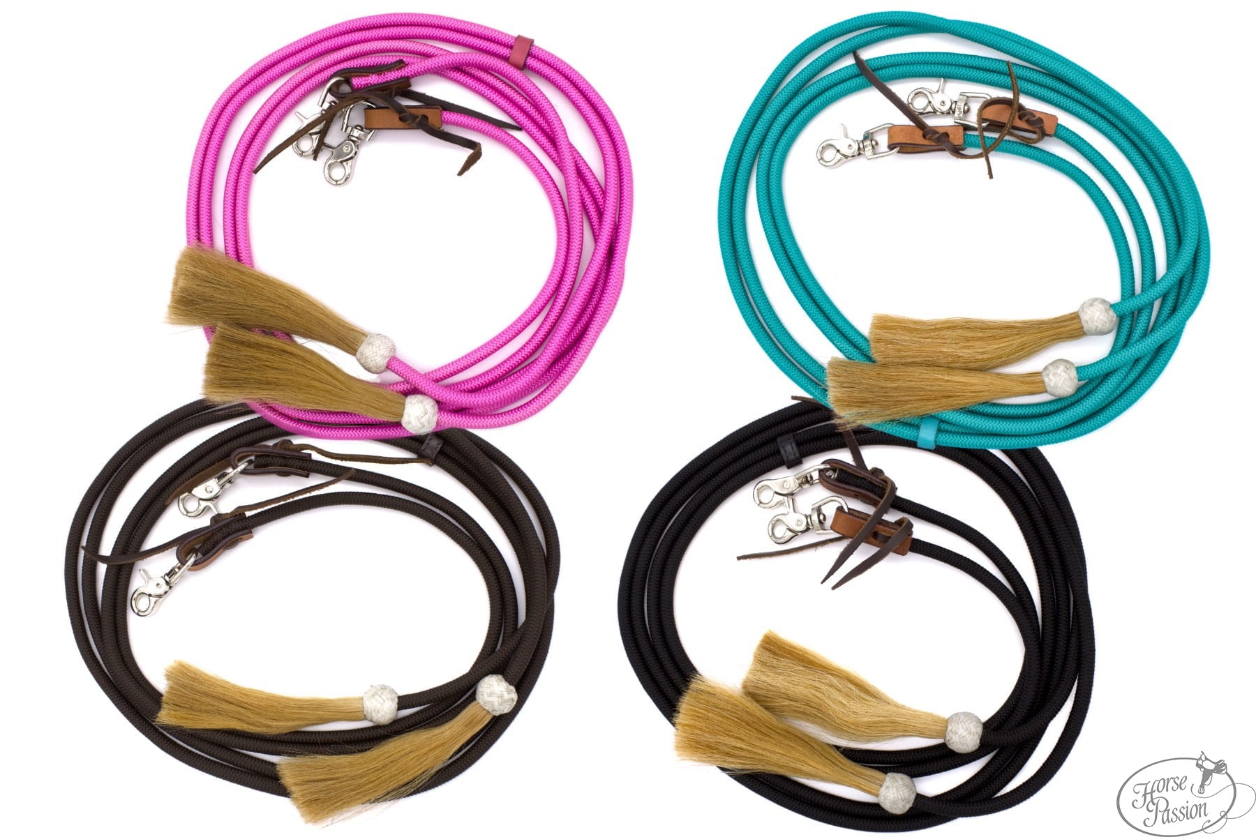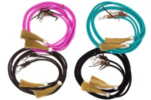Okrągłe nylonowe split reiny LPTrick z chwostami z naturalnego końskiego włosia (ok. 17 cm) i karabińczykami do szybkiego zapięcia. Profil okrągły, średnica ok. 1 cm, długość ok. 230 cm. Dostępne w czterech kolorach: różowy, brązowy, czarny, turkusowy. Lekkie, łatwe w czyszczeniu, miękkie w dłoni — dostępne od ręki.