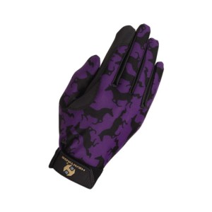 Rękawiczki jeździeckie Heritage z elastycznego materiału Spandura® — fioletowe z motywem koni. Chwytna powierzchnia na dłoni, oddychający grzbiet, doskonałe dopasowanie. Idealne do jazdy rekreacyjnej i codziennej pracy z koniem.