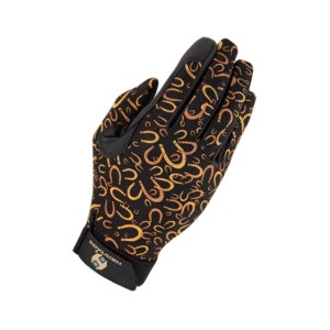 Rękawiczki jeździeckie Heritage z elastycznego materiału Spandura® — w głębokiej czerni z unikalnym wzorem złotych podków (rozmiar XS). Chwytna powierzchnia na dłoni, oddychający grzbiet i dopasowanie niczym "druga skóra". Idealne do codziennych treningów oraz zawodów, gwarantują pełen komfort bez efektu pocących się dłoni.