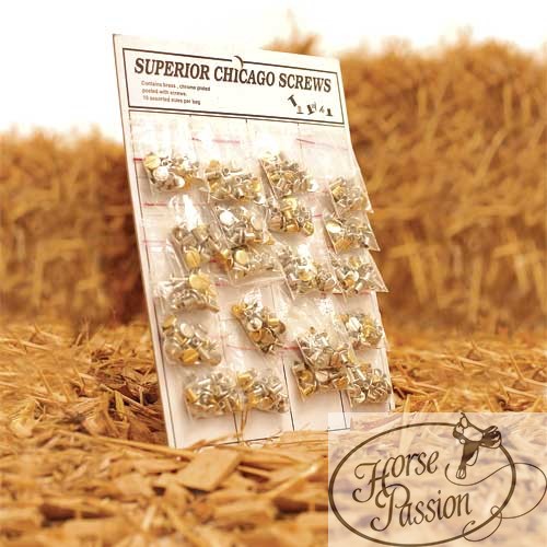 Śrubki Chicago do ogłowia i siodła — zestaw 10 sztuk w różnych rozmiarach i wykończeniach (brass/chrome). Niezbędny zapas naprawczy do każdej skrzynki jeździeckiej — do ogłowi, wodzy, napierśników, pasków do ostróg i akcesoriów skórzanych. Zawsze odpowiedni rozmiar pod ręką.